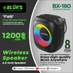 The BLUK’S BX-180 is a stylish 2.5-inch wireless speaker with 8W high-quality sound output. Equipped with Bluetooth 5.3, TWS BQB pairing, and RGB seven-color spectrum lights, it’s designed for both indoor and outdoor entertainment. With multiple playback options (USB, TF, FM, Bluetooth) and long-lasting battery, enjoy music anytime, anywhere.