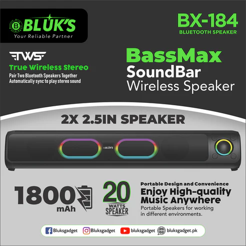 Theย BLUKโS BX-184 BassMax SoundBarย is built for music lovers who wantย deep bass ๐ถ, clear stereo sound ๐, and portable style in one compact speaker. Whether at home, work, or outdoors, it delivers immersive music anywhere, anytime.