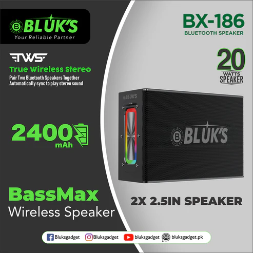 TheΒ BLΓKβS BX-186 BassMaxΒ is built forΒ deep bass πΆ, stereo sound π, and vibrant lighting β¨βdelivering a premium audio-visual experience in a portable design. WithΒ Bluetooth 5.3 π‘Β and dual 10W speakers, it provides powerful, high-fidelity sound anywhere you go.