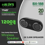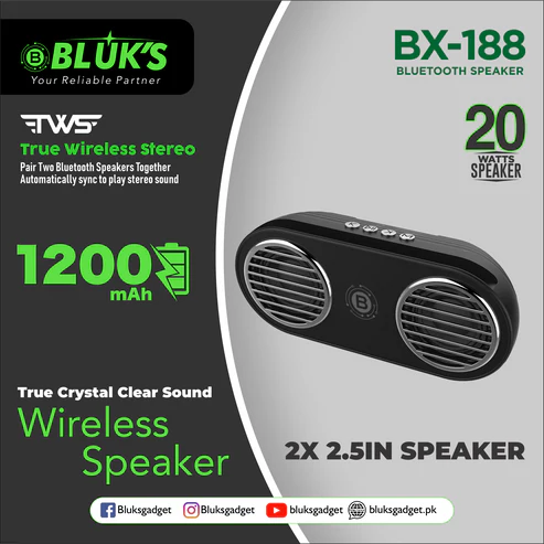 The BLUK’S BX-188 is a stylish wireless speaker that delivers true clarity, balanced bass, and powerful sound in a portable design. With Bluetooth 5.3TWS stereo pairing, and multiple input options, it’s the perfect choice for music at home, outdoors, or parties.