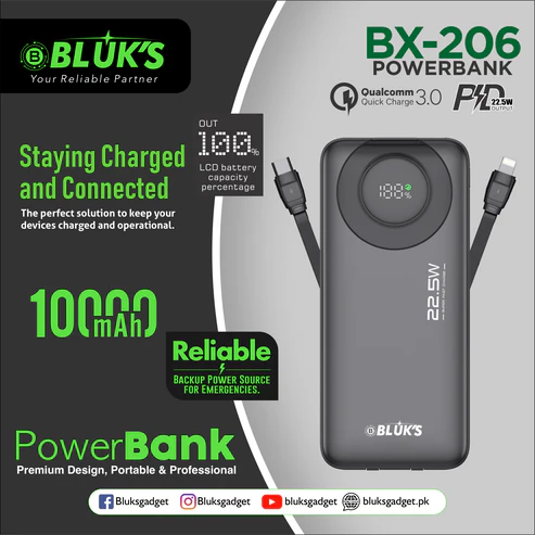 The BLUK’S BX 206 is a sleek and high-performance 10,000mAh power bank designed for users who demand premium quality, portability, and power on the go. Whether you’re commuting, working, or traveling, this compact yet powerful device ensures your devices stay charged and ready when you need them most.