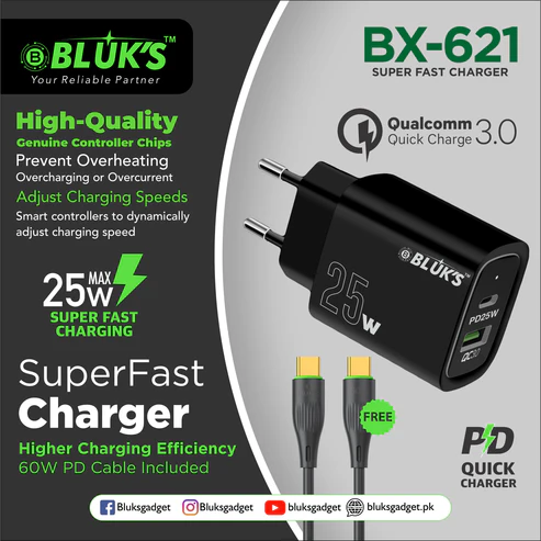 Charge your devices quickly and securely with the BX-621 25W SuperFast Charger. Powered by genuine controller chips, it protects against overheating, overcharging, and overcurrent, ensuring reliable performance every time. With built-in smart controllers, the charger automatically adjusts output to match your device’s needs for optimal efficiency.