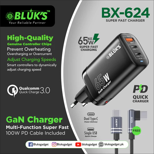 BLUK’S presents the BX-624 FastCharger, a high-speed, multi-device charging solution designed for fast, safe, and reliable charging. Equipped with intelligent power technology and a 1-meter 100W PD cable, this charger is perfect for home, office, or travel use.