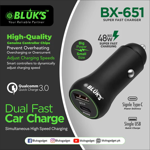 The BX-651 Dual Car Charger delivers a combined 48W of super-fast charging power, making it the ideal companion for on-the-go lifestyles. Equipped with both Power Delivery (PD) Type-C and Qualcomm Quick Charge 3.0 USB-A ports, it charges two devices simultaneously—fast, safe, and reliably.