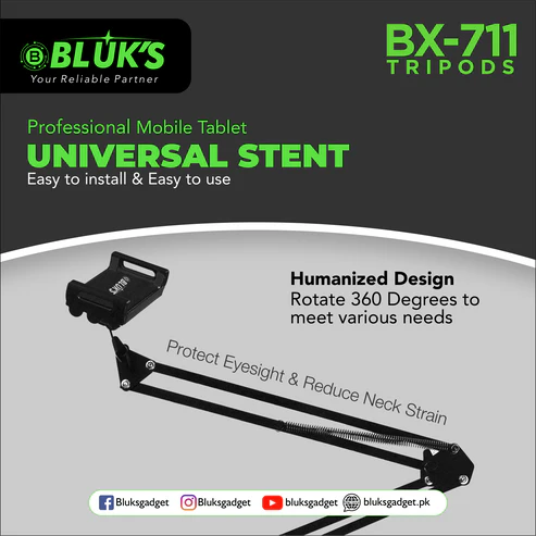 The BLUK’S BX-711 Professional Universal Stent is the ideal solution for comfortable hands-free use of your mobile phone or tablet. Whether you’re watching, reading, video calling, or shooting content, this stand provides optimum viewing angles while helping to reduce neck strain and protect your eyesight.