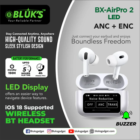 The BX-AirPro 2 delivers premium wireless audio with environmental noise cancellation (ENC) and an LED display for quick navigation and control. Enjoy seamless Bluetooth connectivity, immersive stereo sound, and effortless calls — all in a sleek, in-ear design.