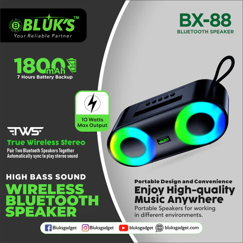The BX-88 Wireless Speaker combines powerful stereo sound with a sleek design. Featuring dual 52mm drivers and enhanced bass, it ensures crystal-clear audio whether you’re indoors, outdoors, or on the move.
